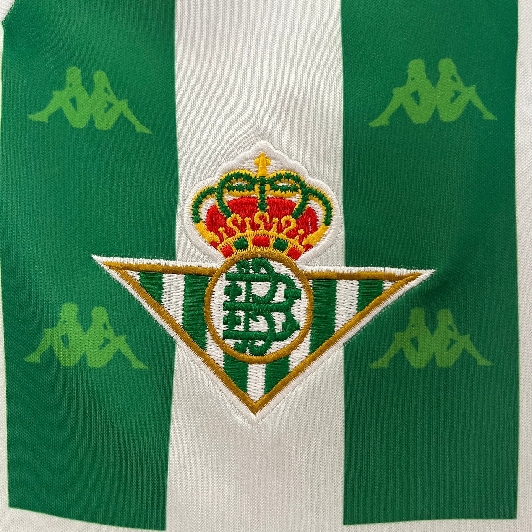 Wappen: Gesticktes Vereinslogo mit Krone und Initialen – stolzes Symbol der königlichen Vergangenheit und tiefen Verankerung in Sevilla.