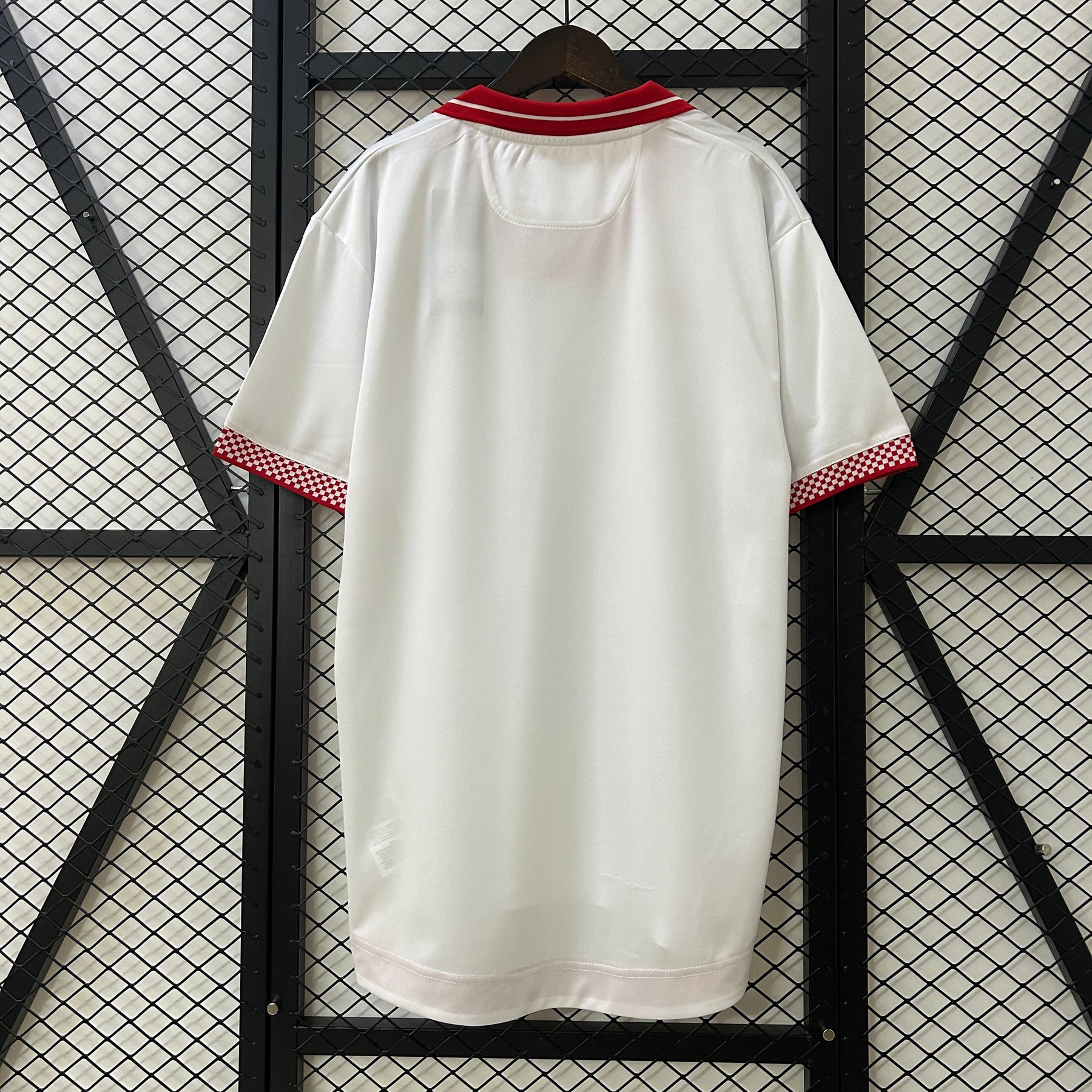 Das Heimtrikot des Sevilla FC aus der Saison 2012–2013 verbindet auf elegante Weise die traditionellen Vereinsfarben mit einem modernen, klaren Design. Die weiße Basis und die dezenten roten Details symbolisieren sowohl das Erbe als auch die Zukunft des andalusischen Fußballs.